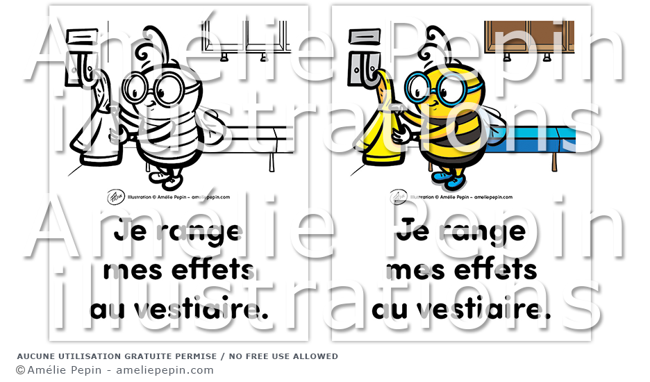 Règle de classe illustrée avec une abeille: "Je range mes effets au vestiaire."