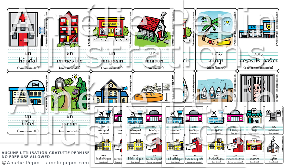 Les mots illustrés sont: aéroport, bibliothèque, boutique, bureau de poste, café, caserne, cimetière, église, cinéma, clinique, crèmerie, école, forêt, garage, gratte-ciel, gymnase, hôpital, hôtel, immeuble, jardin, magasin, mairie, maison, musée, parc, patinoire, pharmacie, piscine, plage, port, poste de police, prison, restaurant, stade, station-service, supermarché, théâtre, université, usine, verger, ville, zoo, lieu, cabane à sucre, campagne, cathédrale, caverne, château, désert, ferme, grotte, igloo, maison hantée, mine, monastère, pyramide, royaume, village, pays, monde.