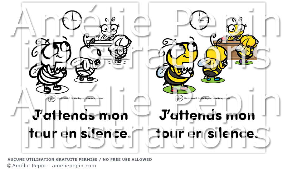 Règle de classe illustrée avec une abeille: "J'attends mon tour en silence."