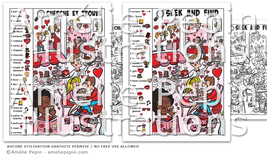 L'enfant cherche et trouve les éléments de la liste dans l'illustration. Les éléments à trouver sont illustrés pour aider l'enfant à apprendre leur nom. C'est un jeu qui développe le sens de l'observation, la concentration et le vocabulaire. L'enfant compte également les éléments jusqu'à cinq. Il y a de l'amour dans l'air dans ce "Cherche et trouve". Une version en noir et blanc est incluse et n'attend qu'à être coloriée!
