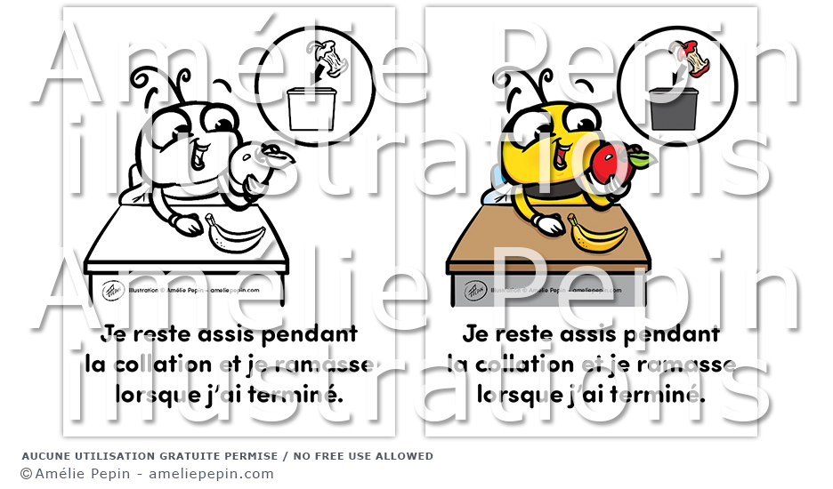 Règle de classe illustrée avec une abeille: "Je reste assis pendant la collation et je ramasse lorsque j'ai terminé."