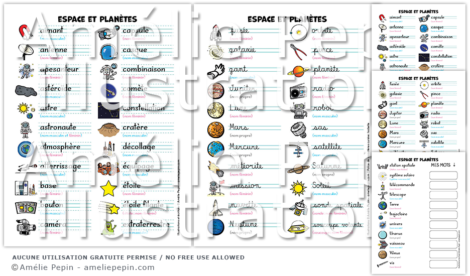 Liste de mots pour apprendre le vocabulaire en lien avec l'espace et les planètes (54 mots sont illustrés). La classe de mots est écrite entre parenthèses sous chaque mot. Quatre versions sont incluses: sans ligne, avec lignes trottoirs, avec lignes doubles ou avec lignes calligraphiques. Une colonne est prévue à la fin du document afin que l'enfant puisse s'exercer à écrire les mots de son choix. Vous pouvez utiliser cet ouvrage comme petit dictionnaire lorsque vous enseignez le thème de l'espace.