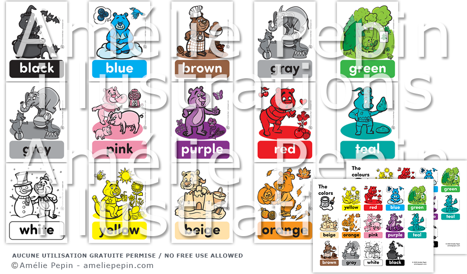 Sur chaque affiche, un ours est entouré d'éléments de la couleur désignée afin que les daltoniens puissent reconnaître les couleurs illustrées. Les couleurs sont: yellow, blue, red, green, orange, pink, purple, teal, brown, beige, gray (grey), black and white. Si vous séparez votre groupe en plusieurs équipes de couleurs différentes, vous pouvez utiliser ces affiches pour les identifier. Les illustrations représentent également certains thèmes, dont l'alimentation, la Saint-Valentin, l'été, l'automne, l'Halloween, l'hiver, les pirates, le cirque, la nature.