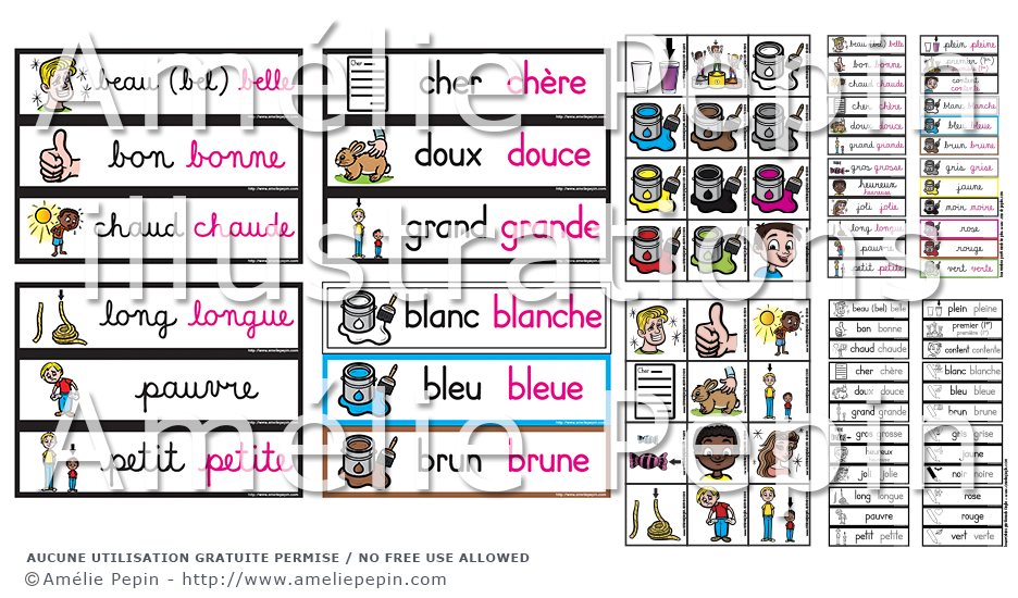 Les adjectifs illustrés sont: beau (bel, belle), bon (bonne), chaud (chaude), cher (chère), doux (douce), grand (grande), gros (grosse), heureux (heureuse), joli (jolie), long (longue), pauvre, petit (petite), plein (pleine), premier (première), content (contente), blanc (blanche), bleu (bleue), brun (brune), gris (grise), jaune, noir (noire), rose, rouge, vert (verte).