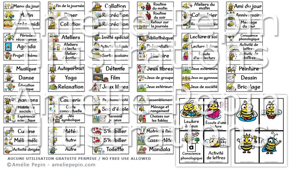 Organisez votre horaire de la journée avec ces étiquettes uniques illustrées au thème des abeilles. Chaque image permet aux enfants de niveau préscolaire de comprendre rapidement le mot affiché. Une page d'abeilles en version PowerPoint vous permet d'ajouter d'autres étiquettes à celles qui sont proposées. Assurez-vous toutefois d'avoir le logiciel PowerPoint installé sur votre ordinateur. Ces petites abeilles égayeront votre classe!