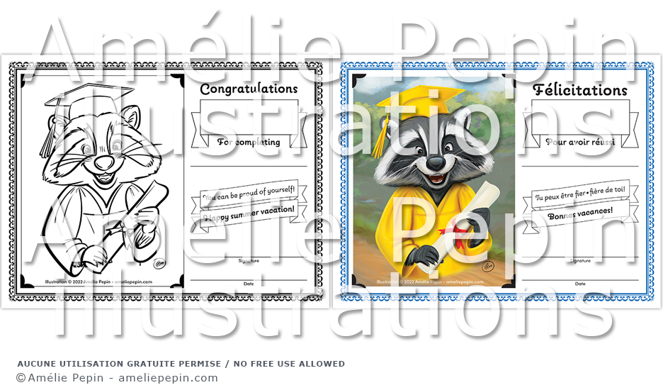 Récompensez la réussite d'une année scolaire complétée avec ce beau diplôme de raton laveur! Les informations à compléter doivent être écrites à la main.
