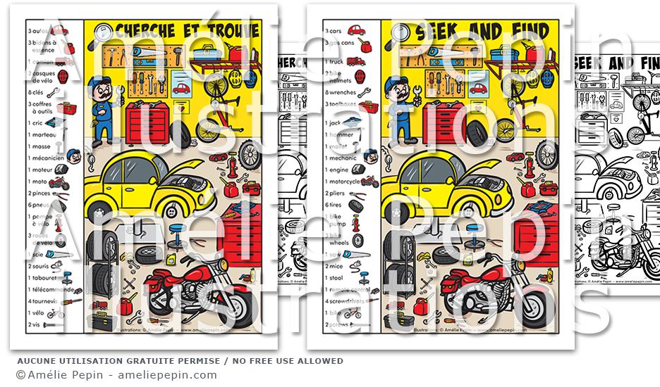 L'enfant cherche et trouve les éléments de la liste dans l'illustration. Les éléments à trouver sont illustrés pour aider l'enfant à apprendre leur nom.