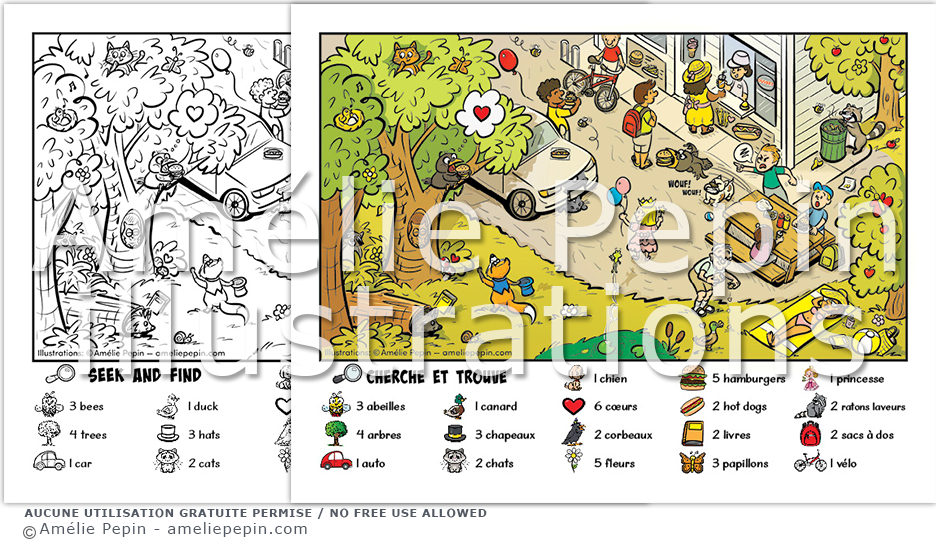 L'enfant cherche et trouve les éléments de la liste dans l'illustration. Les éléments à découvrir sont illustrés pour aider l'enfant à apprendre leur nom. C'est un jeu qui développe le sens de l'observation, la concentration et le vocabulaire. L'enfant compte également les éléments jusqu'à six. Une version en noir et blanc est incluse et n'attend plus qu'à être coloriée!