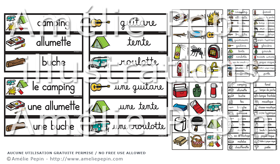 Les mots illustrés sont: camping, allumette, buche, feu, branche, guimauve, guitare, tente, roulotte, sac de couchage, matelas, chaufferette, fanal, lampe de poche, lampe frontale, moustique, chasse-moustique, papier hygiénique, glacière, gourde, bouteille isolante, pique-nique, table à pique-nique, poêle.