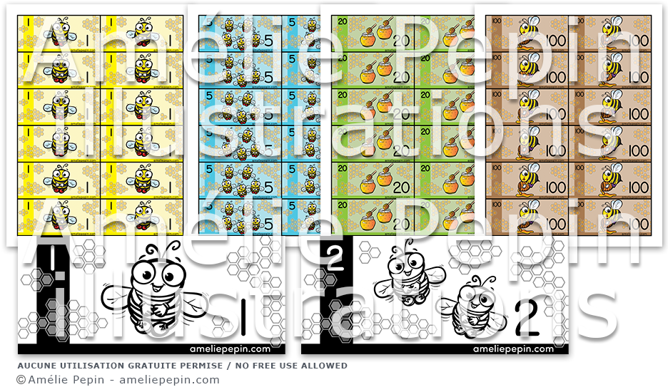 Ces documents contiennent les billets de 1$, 2$, 5$, 10$, 20$, 50$,100$ et 1000$. Complète bien le thème de classe des abeilles!