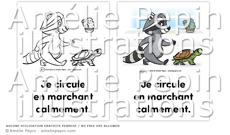 Règle de classe illustrée avec un raton laveur et une tortue: "Je circule en marchant calmement."