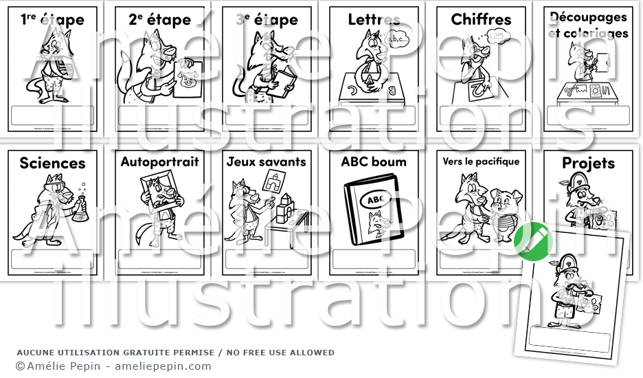 Voici 12 pages couvertures illustrées avec des loups pour identifier les Duo-tangs ou les cahiers. Les titres écrits en français dans la version PDF sont: 1re étape, 2e étape, 3e étape, Autoportrait, Chiffres, Découpages et coloriages, Sciences, Lettres, Jeux savants, ABC boum, Vers le pacifique et Projets.