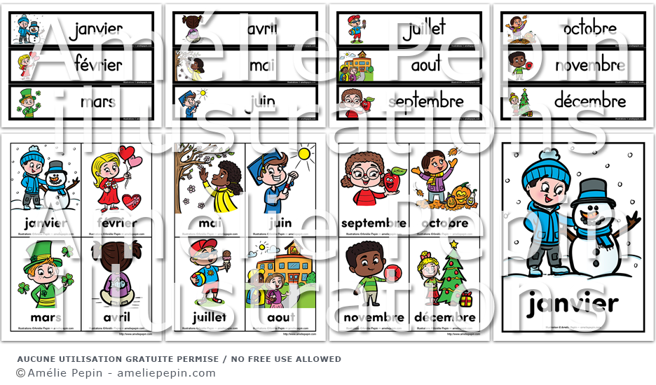 - Formats: 4 mois par page, 3 mois par page (mots-étiquettes), 1 mois par page