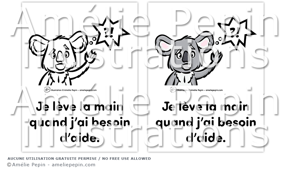 Règle de classe illustrée avec un koala: "Je lève la main quand j'ai besoin d'aide."
