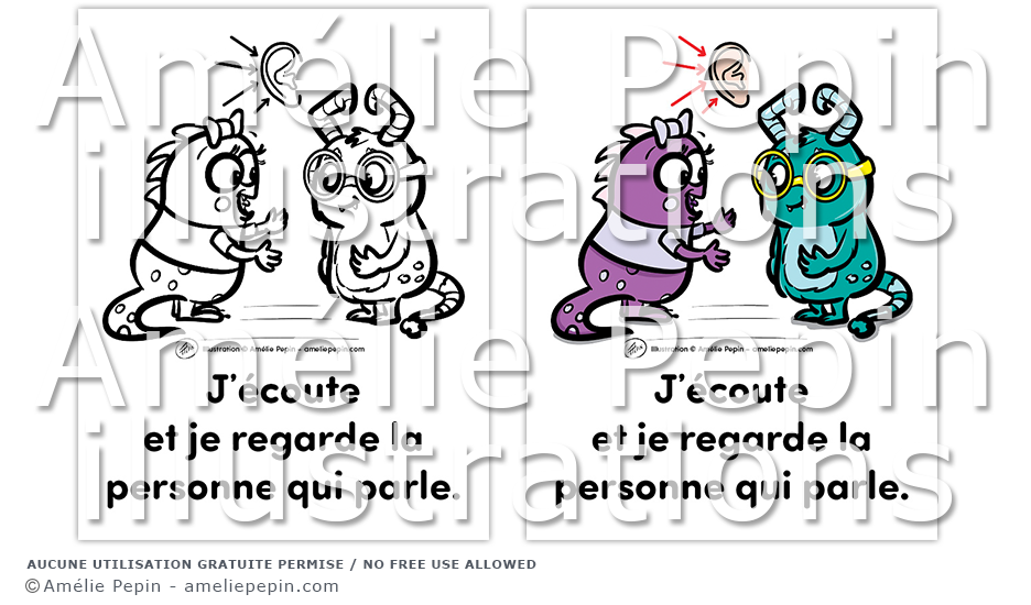 Règle de classe illustrée avec des monstres: "J'écoute et je regarde la personne qui parle."