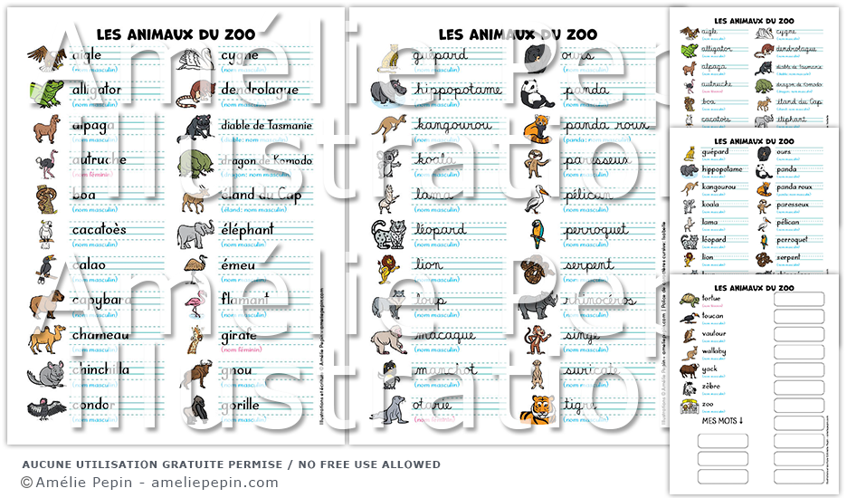 Zoo - Liste de 51 mots illustrés (script et cursif)