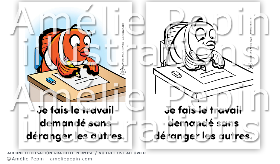 Règle de classe illustrée avec un poisson: "Je fais le travail demandé sans déranger les autres."