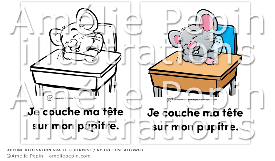 Règle de classe illustrée avec une souris: "Je couche ma tête sur mon pupitre."