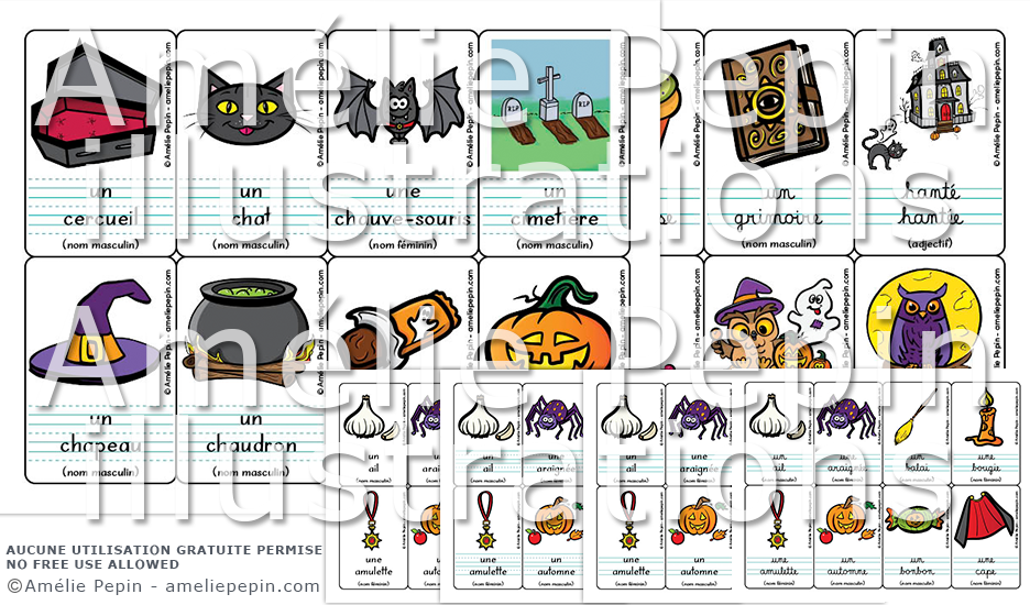 Les mots illustrés sont: ail, amulette, araignée, automne, balai, bonbon, bougie, cape, cercueil, chapeau, chat, chaudron, chauve-souris, chocolat, cimetière, citrouille, collecte, corbeau, crâne, crapaud, croc, croix, danger, décoration, déguisement, Dracula, entrée, épouvantail, fantôme, fée, fête, feu, feuille, Frankenstein, friandise, gomme, grimoire, Halloween, hanté, hibou, horrible, jujube, lampe, loup-garou, lumière, lune, maison, malheur, masque, méchant, momie, monstre, mort, nuit, octobre, oeil, os, peur, potion, rat, réglisse, sang, soir, sorcière, sort, squelette, sucette, toile, pierre tombale, vampire, verrue, voisin, zombie, orange, noir, vert, violet, rouge.