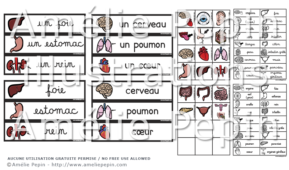 Les mots illustrés sont: organe, oeil (yeux), oreille, langue, nez, peau, cerveau, poumon, coeur, foie, estomac, rein, intestin, intestin grêle, côlon, vessie, pancréas, organes génitaux.