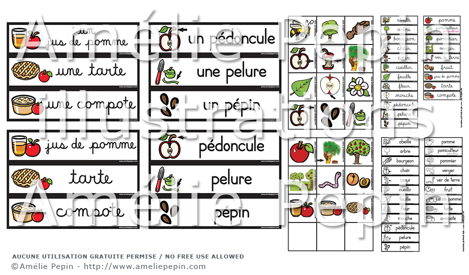 Les mots illustrés sont: abeille, arbre, bourgeon, chair, coeur, cueillir, feuille, fleur, mouche, pédoncule, pelure, pépin, pomme, pomiculteur (pomicultrice), pommier, verger, ver de terre, fruit, jus de pomme, tarte, compote.