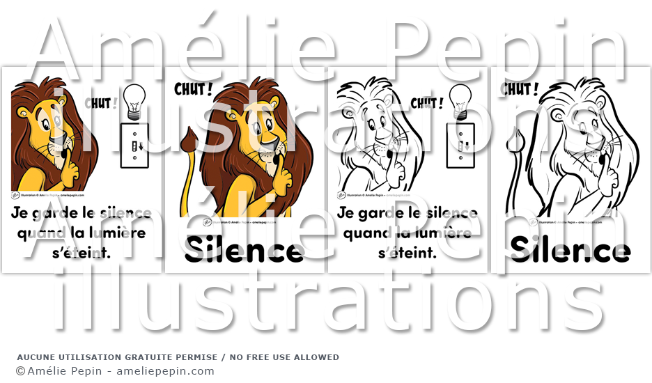Règles de classe illustrées avec des lions: "Silence" et "Je garde le silence quand la lumière s'éteint."