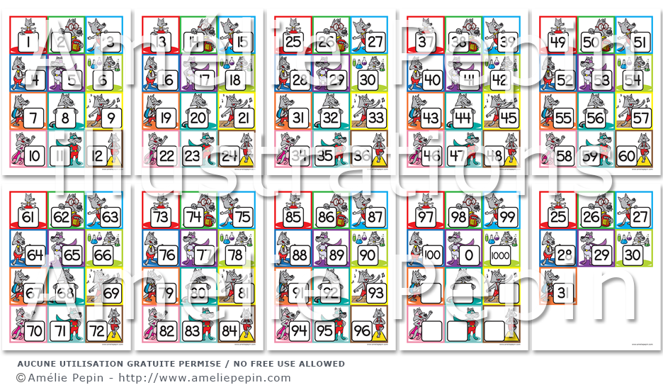 Nombres de 1 à 31 pour calendrier et nombres de 0 à 100 au thème des loups. Il y a 12 nombres par page. Cliquez sur le bouton "Aperçu" afin de visualiser les pages.