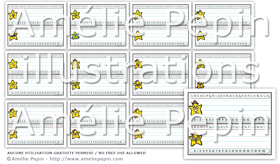Chaque étiquette contient les lettres de l'alphabet avec les voyelles écrites en rouge, un trottoir pour écrire le prénom de l'enfant ainsi que les nombres de 0 à 20. La version PowerPoint vous permet d'écrire le nom de l'enfant à l'ordinateur (il n'y a pas de trottoir dans cette version). Assurez-vous d'avoir le logiciel Microsoft PowerPoint installé sur votre ordinateur pour ouvrir cette version.