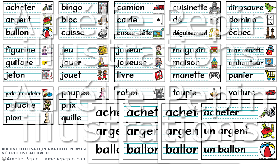 Les mots illustrés sont: acheter, argent, ballon, bingo, bloc, caisse, camion, carte, casse-tête, cuisinette, dé, déguisement, dinosaure, domino, jeu d'échecs, figurine, guitare, jeton, jeu de société, jouer, jouet, joueur (joueuse), livre, magasin, maison, manette, marionnette, nourriture, ordinateur, panier, pâte à modeler, peluche, pion, poupée, prix, quille, robot, tablette, tic-tac-toe, toupie, train, vélo, voiture, yoyo, ranger.