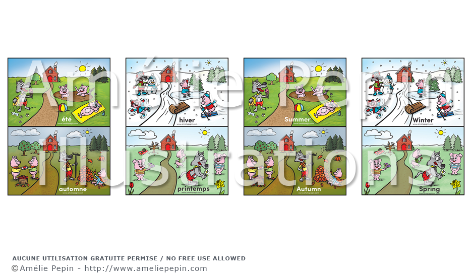 Les saisons représentées par les 3 petits cochons et le loup (gentil).