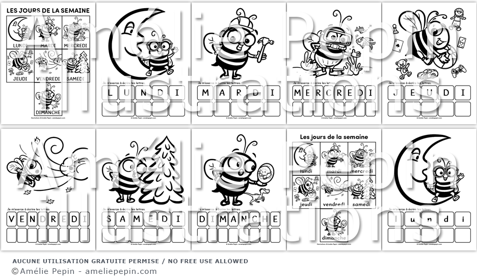 Chaque jour de la semaine est représenté par une abeille à colorier avec un élément dont le son débute par la première syllabe du jour (DImanche, DInosaure). Vous pouvez demander à l'enfant de colorier seulement l'élément qui représente le son ou tout le dessin en entier. En bas de page, l'enfant peut s'exercer à écrire les lettres du jour. La première page du document contient un aide-mémoire des jours de la semaine.