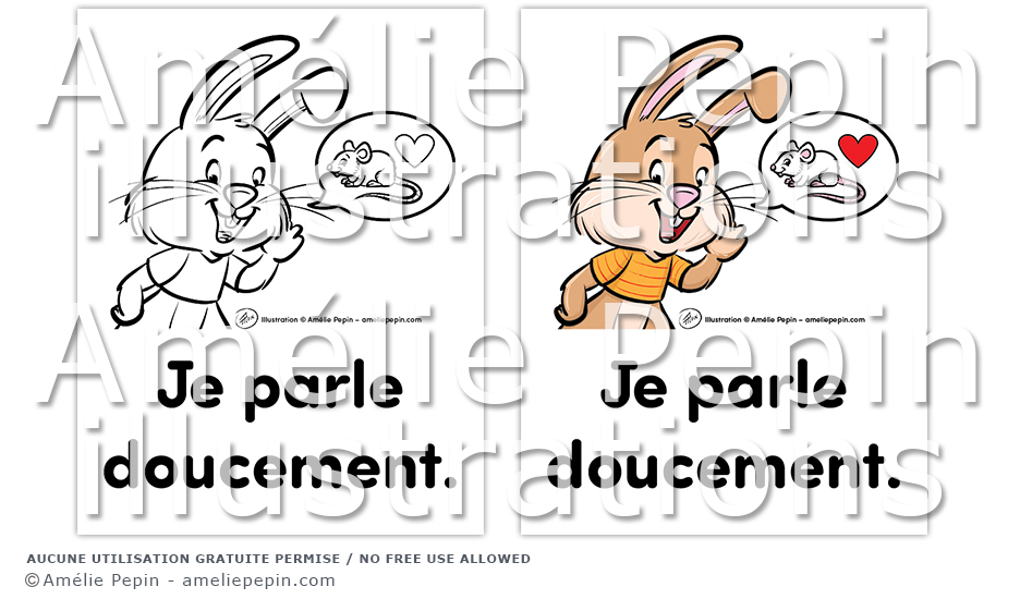 Règle de classe illustrée avec un lapin: "Je parle doucement."