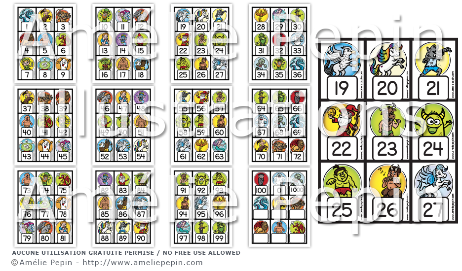 Nombres de 1 à 31 pour calendrier et nombres de 0 à 100 au thème des créatures légendaires. Il y a 9 nombres par page. Cliquez sur le bouton "Aperçu" afin de visualiser les pages.