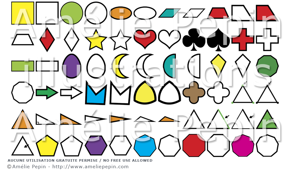 Le dossier contient les figures suivantes: carré, rectangle, triangles, pentagone, hexagone, heptagone, octogone, ennéagone, décagone, cercle, ellipse, ovale, demi-cercle, parallélogramme, trapèze, quadrilatère, losange, polygone concave, étoile, croissant, cœur, trèfle, pique, croix, flèche, sommet, côté, surface et autres.