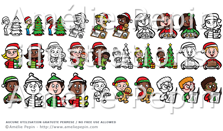 Le dossier contient 10 enfants différents au thème de Noël avec deux choix de coloration chacun.