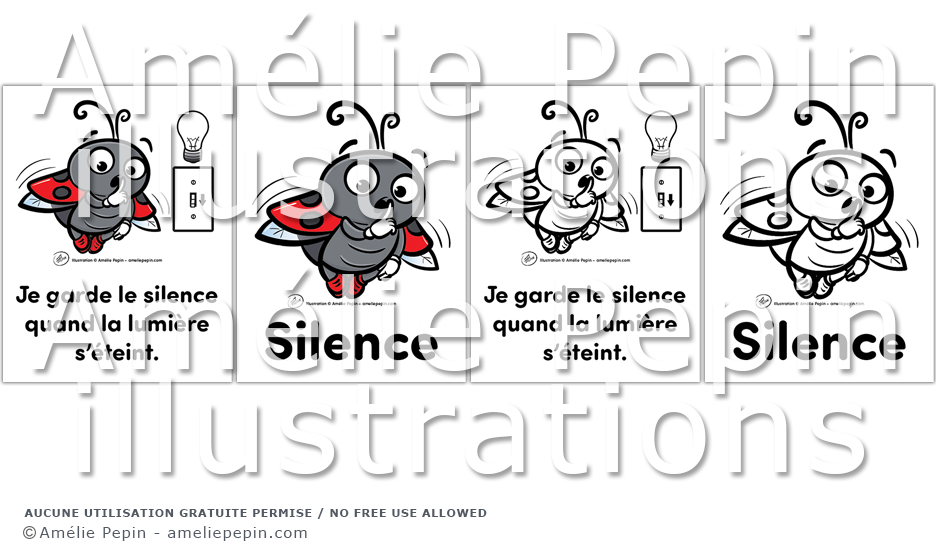 Règles de classe illustrées avec des coccinelles: "Silence" et "Je garde le silence quand la lumière s'éteint."