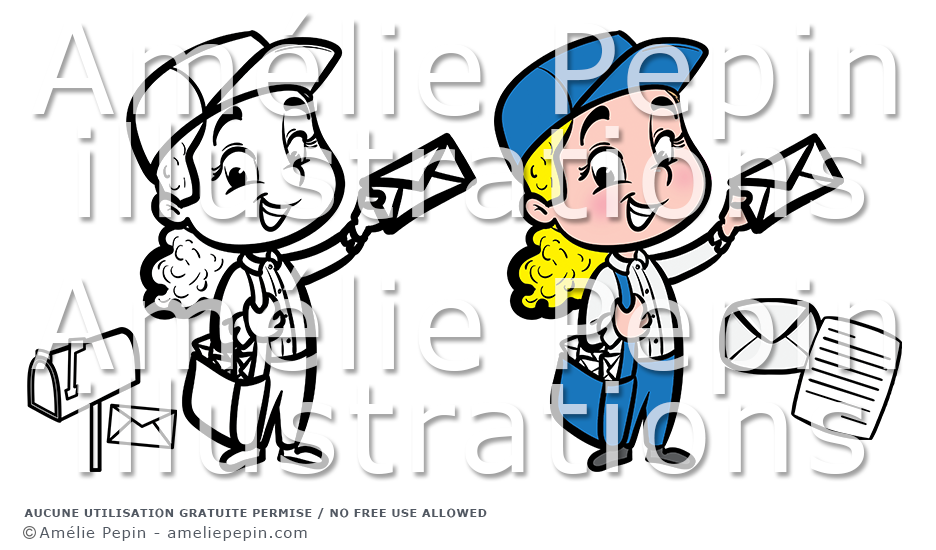 Ce dossier contient 2 boîtes aux lettres, une lettre et son enveloppe ainsi que 2 modèles d'enfants habillés en facteur (messager). Quelques choix de couleurs de peau sont offerts.