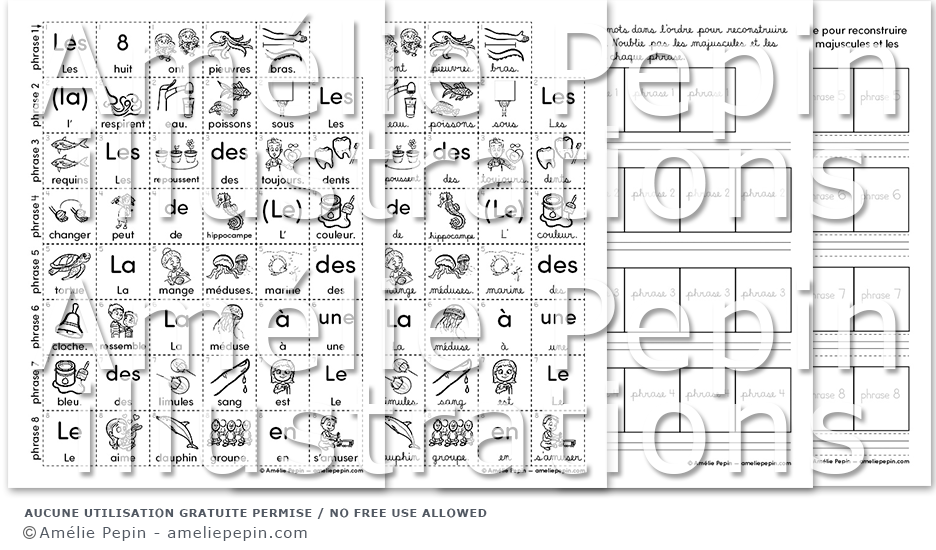 L'enfant découpe les mots illustrés de la page 3 du document (une rangée correspond à une phrase). Il replace les mots en ordre pour former une phrase et il les colle dans les carrés aux pages 1 et 2. Il peut ensuite écrire les phrases obtenues dans les trottoirs (écriture script) ou dans les lignes doubles (écriture cursive). Dans chaque phrase, la lettre majuscule et le point sont indiqués sur les images afin d'aider l'enfant. Les phrases contiennent de 5 à 6 mots.