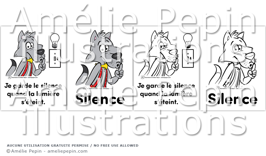 Règles de classe illustrées avec des loups: "Silence" et "Je garde le silence quand la lumière s'éteint."