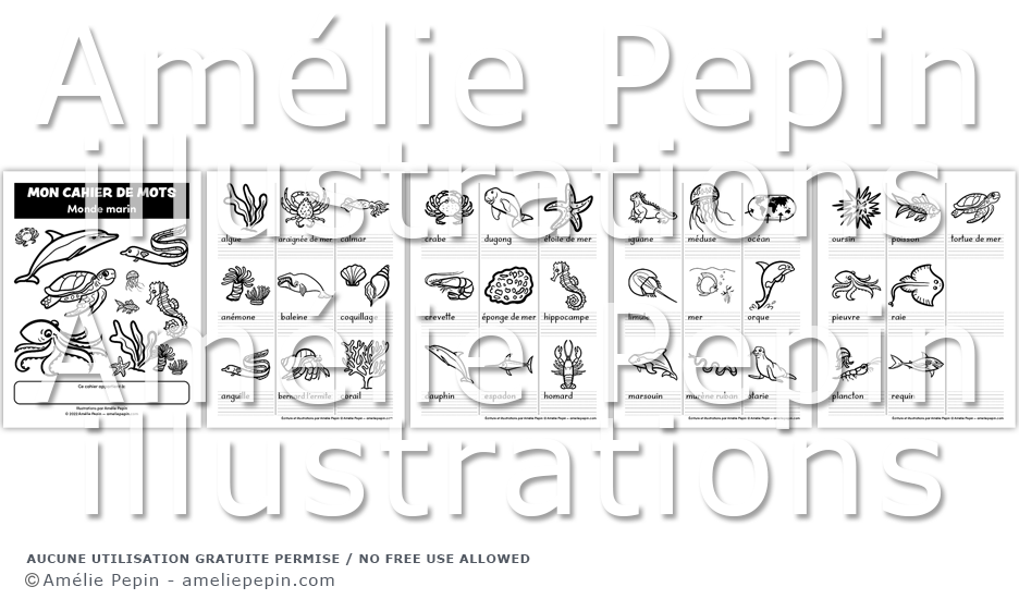 Utilisez ce document en tant que recueil de mots illustrés (dictionnaire) ou comme cahier d'écriture de mots sur le thème de la mer et du monde marin. Les enfants peuvent colorier les dessins. Quatre versions sont incluses: sans lignes (rectangles pour écrire), avec lignes trottoirs, lignes doubles ou lignes calligraphiques.