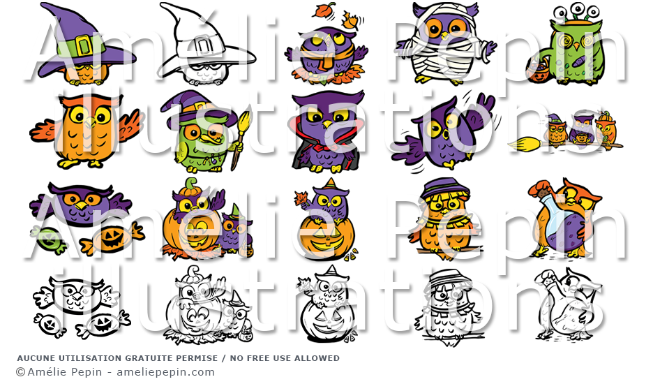 Le dossier contient: un hibou avec un grand chapeau, un hibou avec des feuilles d'automne, un hibou momie, un hibou monstre, un hibou neutre, un hibou sorcière, un hibou vampire, un hibou qui vole, trois hiboux sur un balai, des bonbons, des hiboux avec des citrouilles, un hibou épouvantail et un hibou avec une potion.
