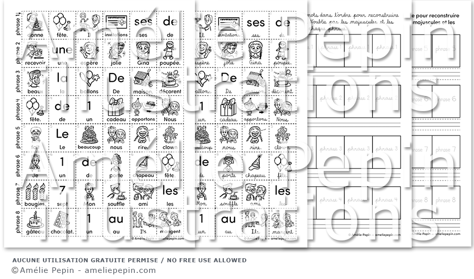 L'enfant découpe les mots illustrés de la page 3 du document (une rangée correspond à une phrase). Il replace les mots en ordre pour former une phrase et il les colle dans les carrés aux pages 1 et 2. Il peut ensuite écrire les phrases obtenues dans les trottoirs (écriture script) ou dans les lignes doubles (écriture cursive). Dans chaque phrase, la lettre majuscule et le point sont indiqués sur les images afin d'aider l'enfant. Les phrases contiennent de 6 mots.