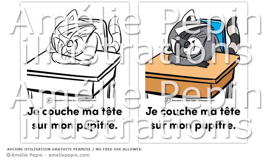 Règle de classe illustrée avec un raton laveur: "Je couche ma tête sur mon pupitre."