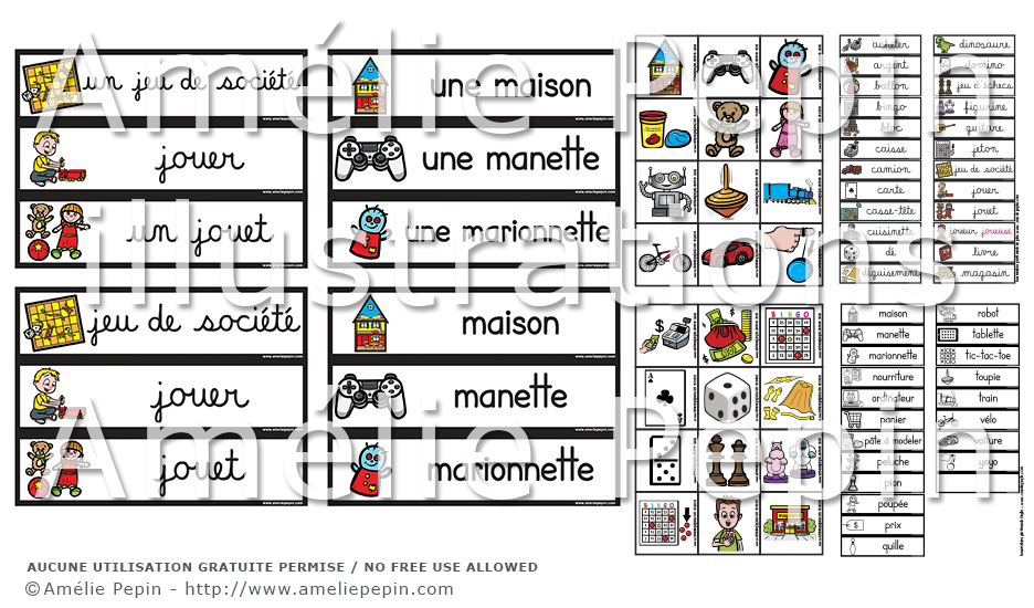 Les mots illustrés sont: acheter, argent, ballon, bingo, bloc, caisse, camion, carte, casse-tête, cuisinette, dé, déguisement, dinosaure, domino, jeu d'échecs, figurine, guitare, jeton, jeu de société, jouer, jouet, joueur (joueuse), livre, magasin, maison, manette, marionnette, nourriture, ordinateur, panier, pâte à modeler, peluche, pion, poupée, prix, quille, robot, tablette, tic-tac-toe, toupie, train, vélo, voiture, yoyo.