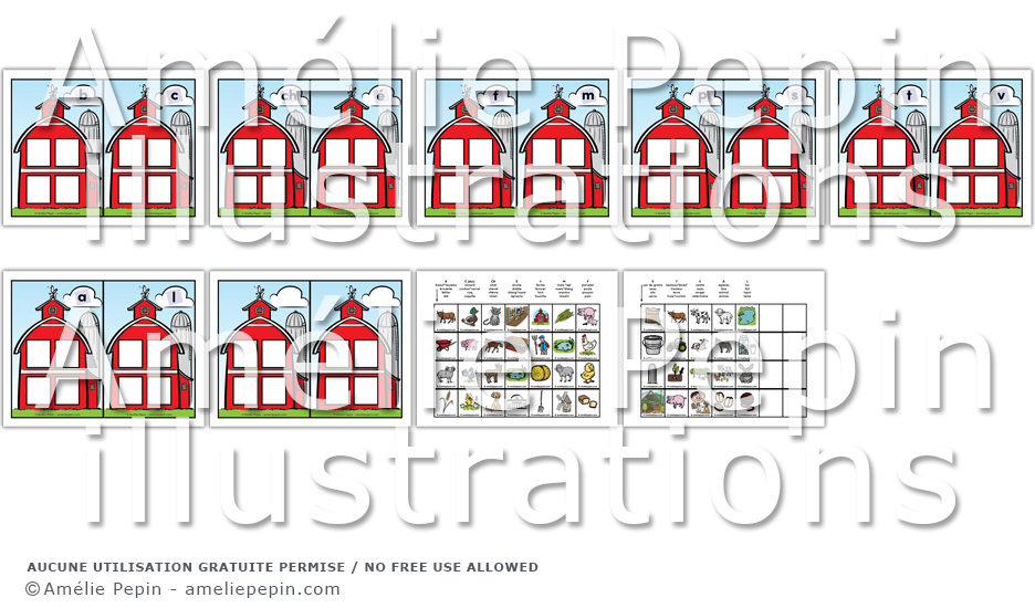 Chaque ferme contient un son vedette (a, b, c dur, ch, é, f, l, m, p, s, t, v). L'enfant place quatre images dans la ferme dont le nom débute par la lettre vedette. Par exemple, pour la lettre C, l'enfant place les images: canard, cochon, coq, coquille. Certaines images peuvent être placées à différents endroits selon le mot perçu par l'enfant, il est donc important de lui demander le nom de l'image si vous ne les mentionnez pas. La liste des mots est inscrite sur les pages d'illustrations.