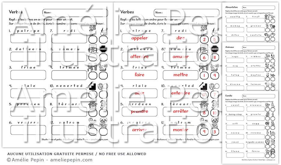 Dans cette activité, l'élève replace les lettres en ordre pour former les douze mots par page. Ensuite, il écrit les numéros qui correspondent aux mots trouvés sur les images de droite. Les mots demandés font partie de la liste orthographique du ministère de l'Éducation, 1re et 2e années. Les thèmes exploités sont: alimentation, animaux, nombres, école, famille, noms communs, adjectifs, adverbes et verbes (x2).