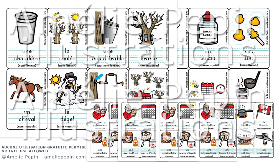 Les mots illustrés sont: acériculteur, acéricultrice, avril, beurre d'érable, bouillir, cabane, Canada, chalumeau, chaudière, cheval, coulée, dégel, eau d'érable, entaille, érable, érablière, évaporateur, feuille, gel, jour, mars, nuit, printemps, raquettes, repas, saison, sève, sirop, sucre, temps, tire, trempette, tubulure, vilebrequin, cornet à la tire, fèves au lard, grands-pères dans le sirop, famille, motoneige, récolte, transformation, manger, crêpe, jambon, oreilles de crisse, musique, chanson, Québec.