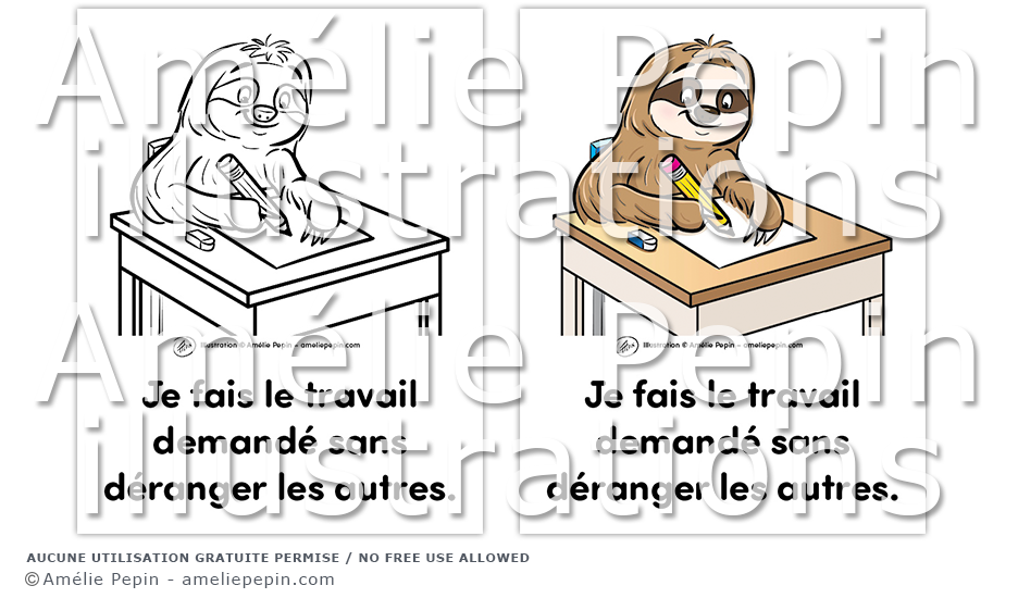 Règle de classe illustrée avec un paresseux: "Je fais le travail demandé sans déranger les autres."