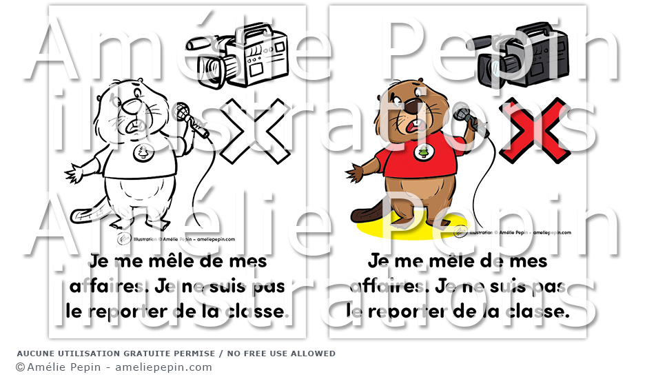 Règle de classe illustrée avec un castor: "Je me mêle de mes affaires. Je ne suis pas le reporter de la classe."