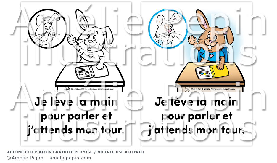 Règle de classe illustrée avec un lapin assis au bureau: "Je lève la main pour parler et j'attends mon tour."